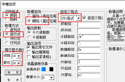 2. 点击「选项」进行字模配置。通常字模配置要根据程序驱动方式来选择,本篇中我们选择阴码、逐行式、顺向,其他选项如下图所示。