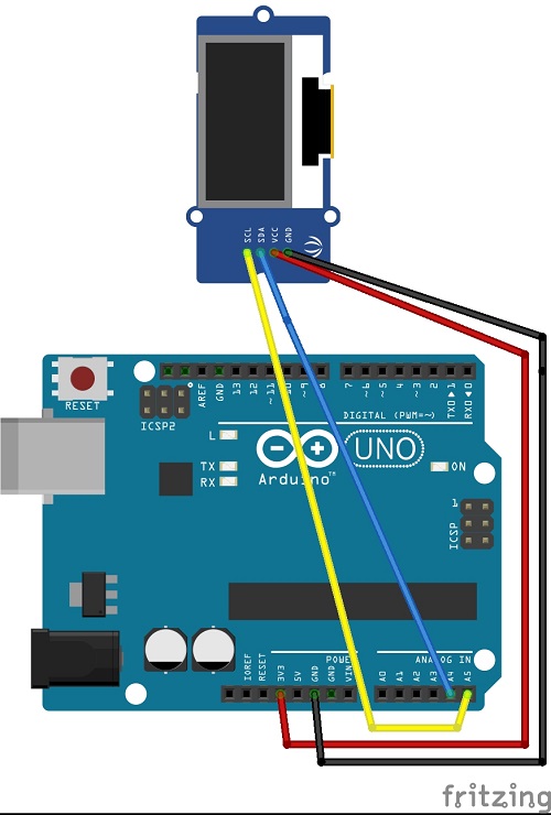 IIC接口只需要两根线。OLED屏的VCC和GND分别连接开发板的3.3V和GND,OLED屏的SDA和SCL分别连接开发板A4和A5。