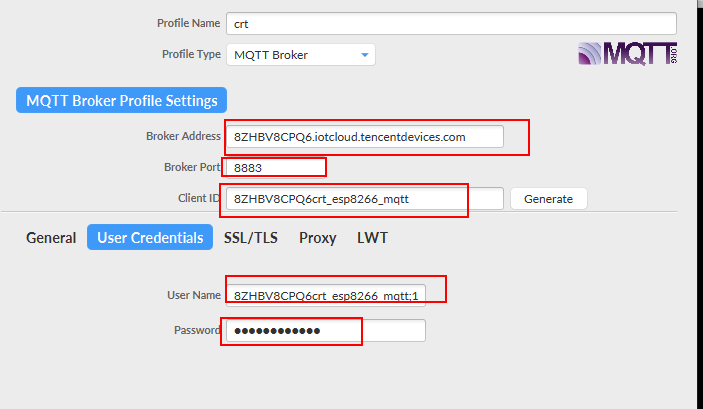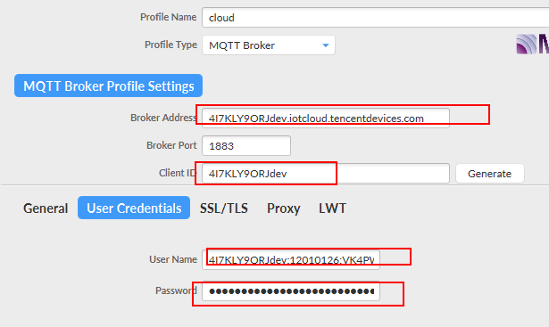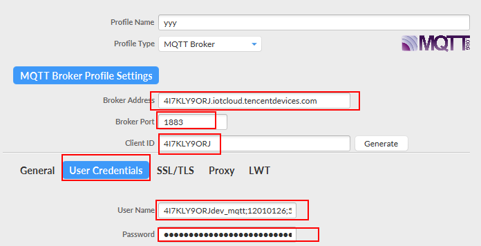 - User Name :MQTT 协议字段,按照物联网通信约束填入:产品 ID + 设备名 + SDKAppID + connid。(创建完产品即可在产品列表页和产品详情页查看 ProductID)如:"9****ZW2EZgate_dev01;12010126;12345",仅替换示例中的产品 ID + 设备名即可,后面的两个参数本身由物联网通信接入 SDK 自动生成,所以这里填写固定测试值。