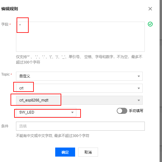点击名字进入→字段*表示不筛选→topic(选刚才建立的mqtt)→条件为空(任意)→确定