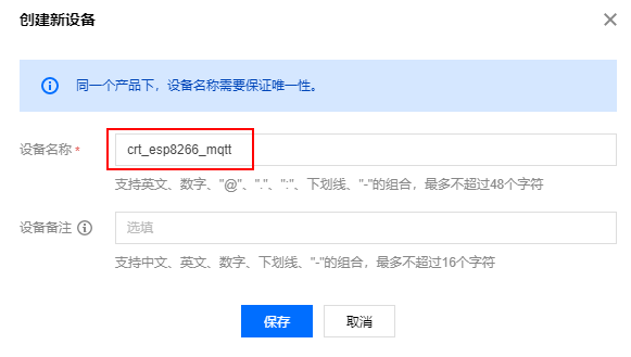MQTT 协议字段,按照物联网通信约束填入:产品 ID + 设备名,例如:"9****ZW2EZgate_dev01 ",9****ZW2EZ 是产品 ID,gate_dev01 是设备名。 |