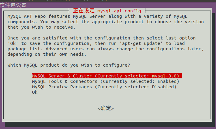 第一个界面会问你要配置哪个产品,默认就是 "MySQL Server & Cluster",直接按回车键选择 "Ok"。
