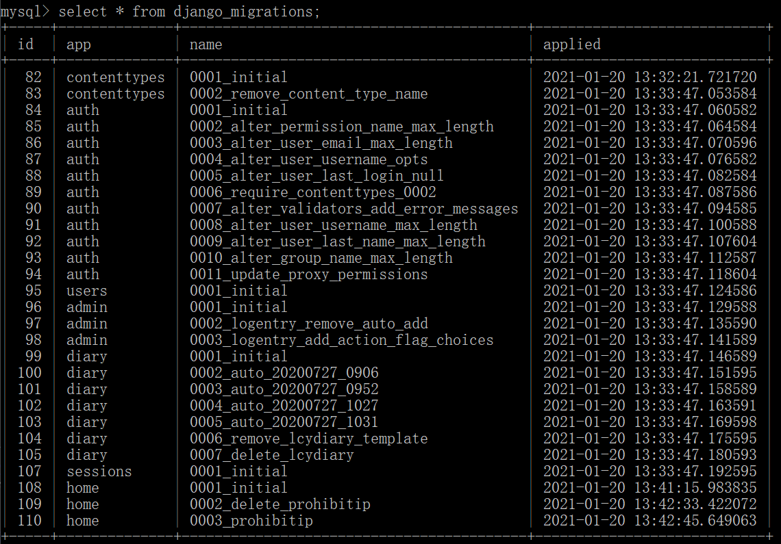 Django的默认数据库表中有两张特别重要的表,一个是django_migration,另一个就是django_content_type。前者记录了django工程中每一个已注册app下的migrations目录下执行python manage.py makemigration生成的initial文件和app的关系,用于django来根据对应的initial文件生成sql语句操作数据库表;而后者则是一个记录已经initial过的app的相关信息。