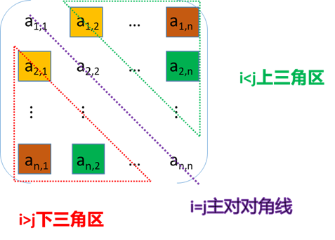 对称矩阵中的元素关于主对角线对称,故只要存储矩阵中上三角或下三角中的元素,让每两个对称的元素共享一个存储空间,这样,能节约近一半的存储空间。不失一般性,按 " 行优先顶序 " 存储主对角线(包括对角线)以下的元素,其存储形式如图所