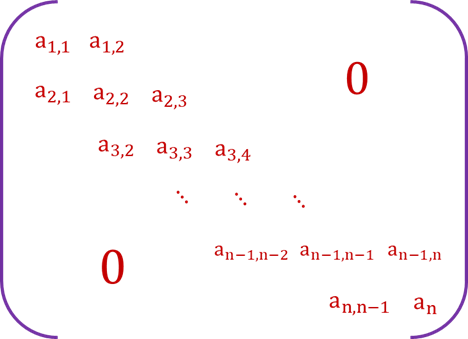 三对角矩阵 若对一个n阶方阵A中的任意元素ai,j,当|i-j|>1,有ai,j=0(1<I,j≤n),则称为三对角矩阵。