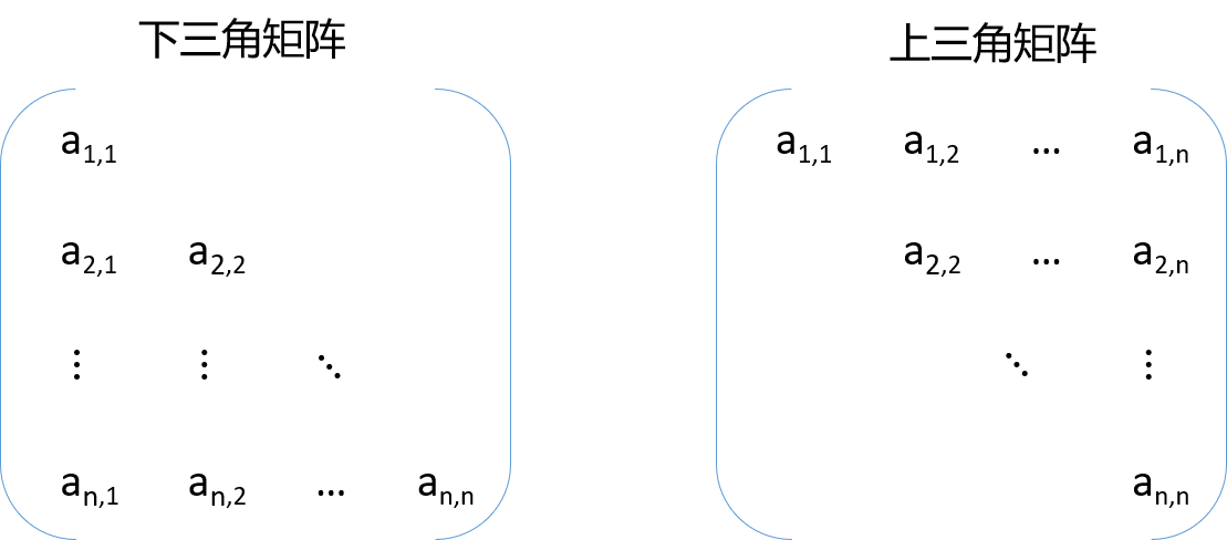 三角矩阵 若对一个n阶方阵A[1..n][1...n]中上(下)三角区元素均为同一常量,则称为下(上)三角矩阵。
